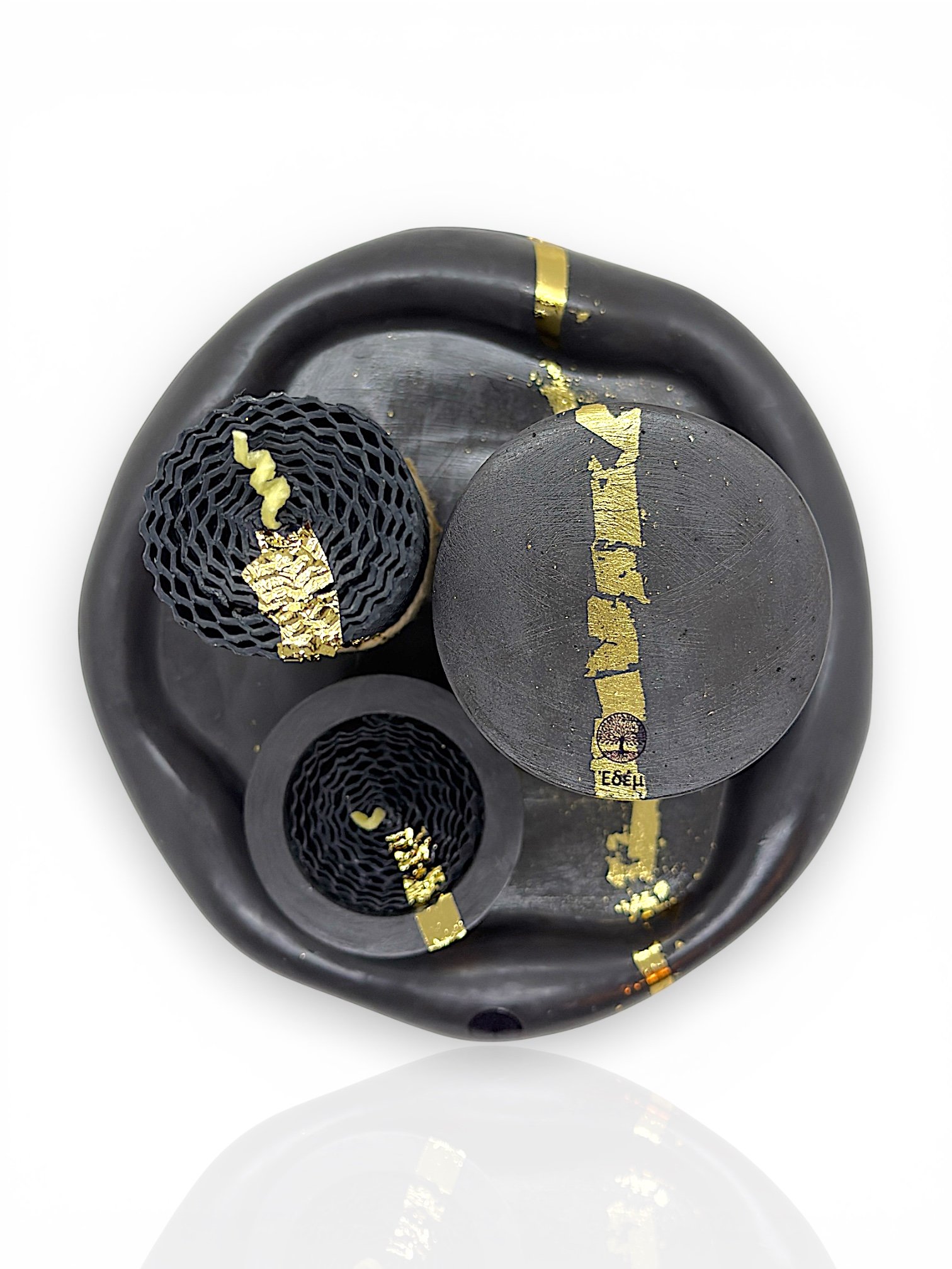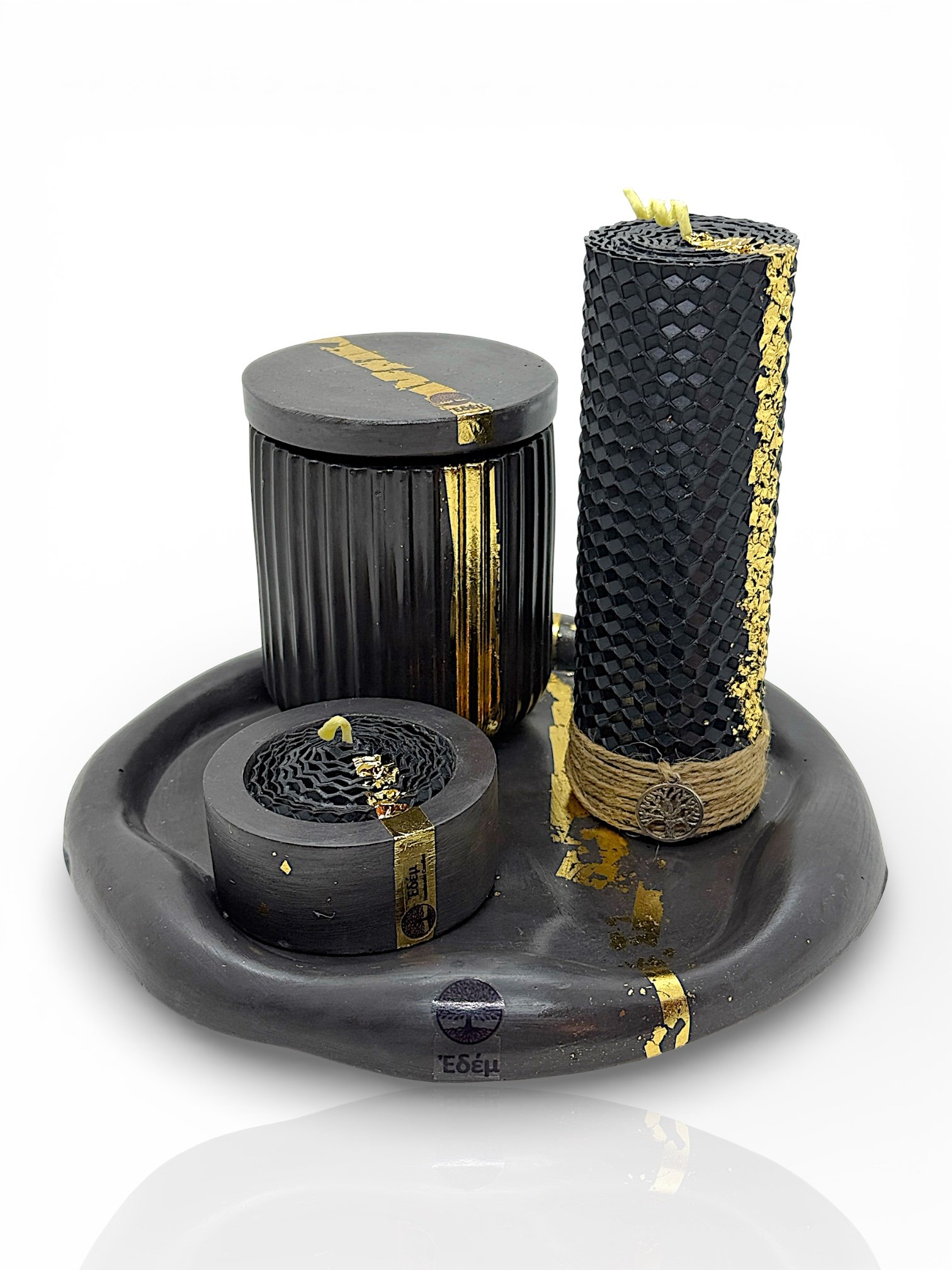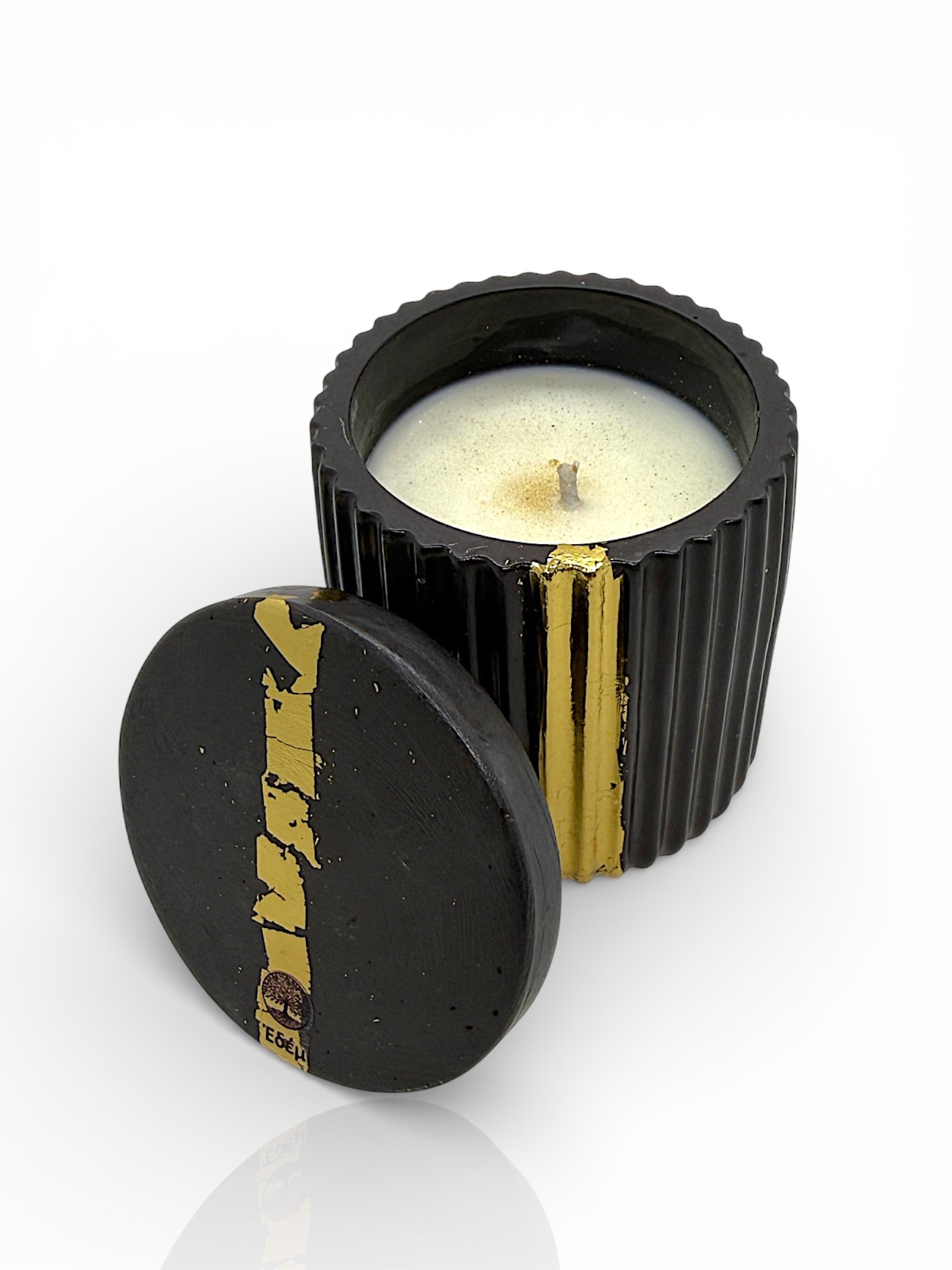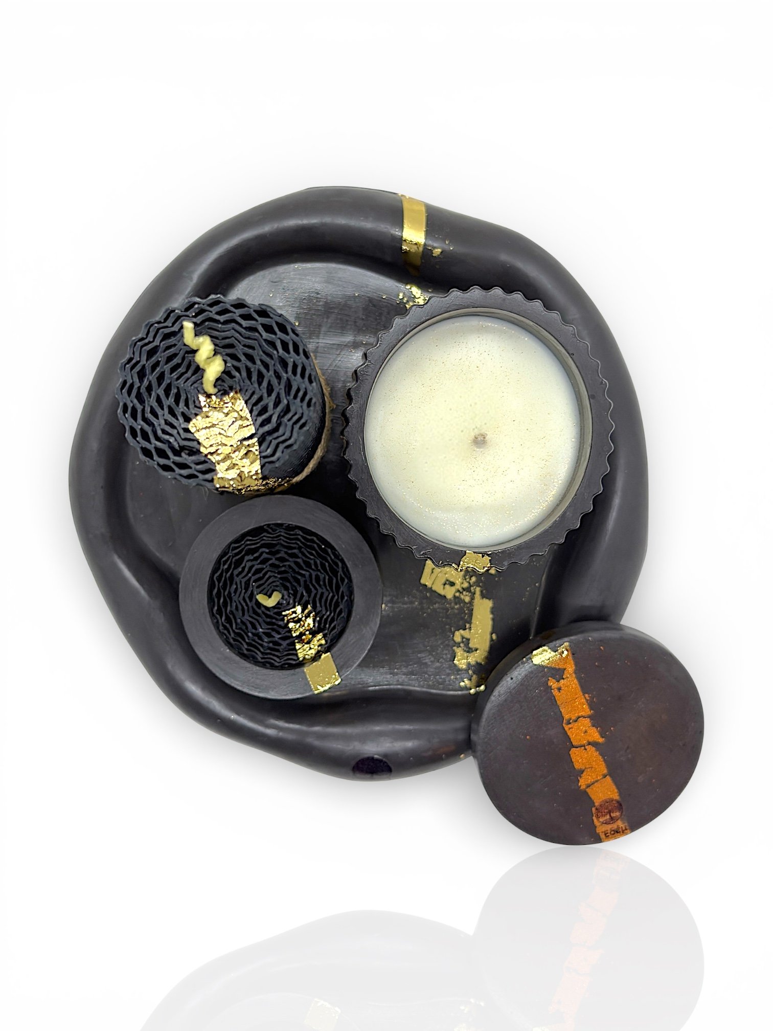 - 2 Κεριά σε Δοχεία: Χειροποίητα δοχεία πορσελάνης με εντυπωσιακή μαρμάρινη υφή (μαύρη) και χρυσές λεπτομέρειες από φύλλο χρυσού, γεμισμένα με φυσικό κερί σόγιας.
